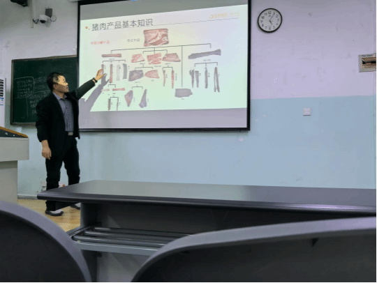 刘建生围绕“专业赋能、产教衔接”的主线,系统讲解了猪肉产品基础知识、加工技术与行业动态。他剖析了屠宰率、瘦肉率等关键指标,比较了不同肉类的安全与营养特性,指出冷鲜肉市场潜力巨大。此外,他还介绍了CO₂致晕等先进加工工艺及标准化分割流程,结合数据阐述了生猪屠宰行业“一减四增”的规模化、标准化发展趋势。