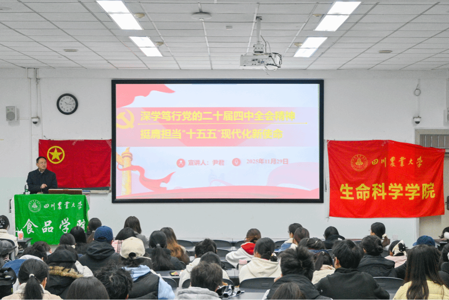 为深入学习贯彻党的二十届四中全会精神,进一步筑牢青年学员思想根基,提升理论素养与使命担当,11月29日,四川农业大学离退休管理处副处长尹君副教授应邀在10教A102,为食品学院与生命科学学院的青马精进班学员,作题为“深学笃行党的二十届四中全会精神,挺膺担当‘十五五’现代化新使命”的专题讲解。