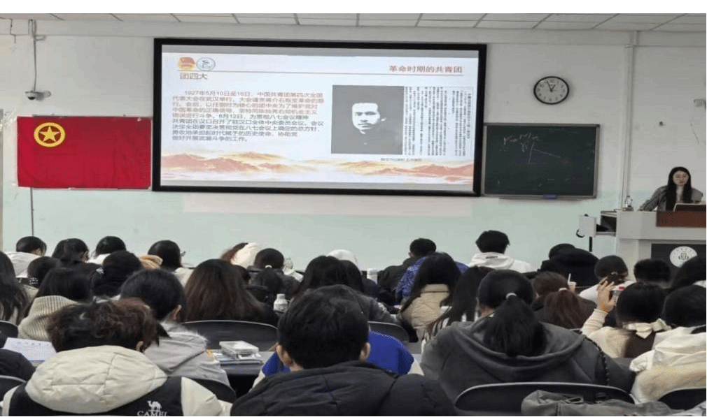 团课在庄严而热烈的氛围中拉开序幕。高晓倩以“团史青年学”为主题,为同学们带来了一场内容详实、脉络清晰的百年团史导览。高晓倩以时间为线,从五四运动、团一大讲起,系统梳理了共青团自1922年成立以来的名称演变、核心任务与发展历程,内容涵盖革命战争时期的斗争、新中国成立后组织的发展与学雷锋活动,以及改革开放后的拨乱反正,结合“五卅运动”“一二·九运动”等事件和《白鹿原》等文艺作品背景,生动描绘出共青团在党的领导下带领青年奋斗的历史画卷。随后,高老师以新时代为背景,重点介绍了共青团在思想引领、服务青年和动员建功等方面的新作为,结合“青年文明号”“跨世纪青年人才工程”及黄文秀等青年榜样的事迹,强调艰苦奋斗精神的传承。她指出,共青团十九大号召青年在“十五五”时期建功立业,呼吁同学们学好专业、遵守校纪、积极参与实践,将个人成长融入国家发展。