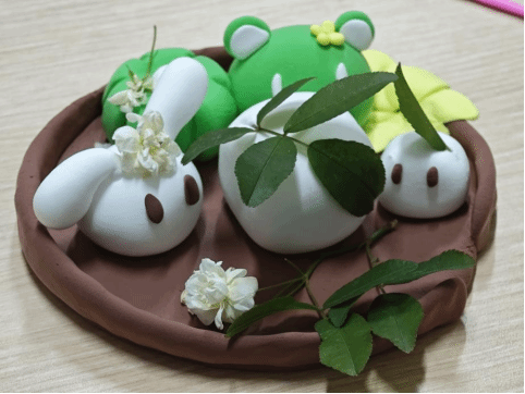 宣讲结束后,趣味青团制作环节正式开启。活动中,同学们用踏青时收集的自然材料装饰粘土青团。大家围坐一堂,认真专注地为青团设计花纹、搭配色彩,将心意融入作品之中。成品既保留了传统特色,又融入了青春创意,体现了新时代青年对传统文化的创新理解。制作完成后,同学们依次展示作品,并分享各自的创作灵感。