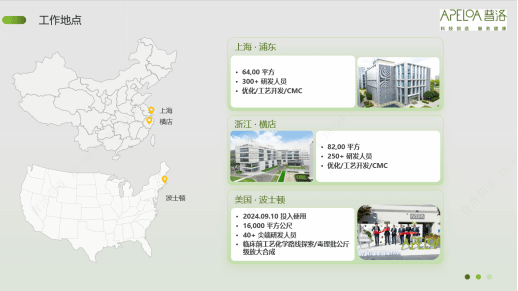 目前CDMO研发中心共有3个研发基地,分别在上海浦东,浙江横店以及美国波士顿。目前研发人员团队规模为700+,随着上海CDMO新实验楼的投入使用、横店CDMO新研发楼建设、生物研发平台的建成以及流体化学实验室、高活性物质(API)实验室、安全实验室、两个高活性药物车间、两个多功能CDMO标准化车间和四个原料药生产车间的陆续建成及运行,将会为客户提供更优质、高效的CDMO服务。