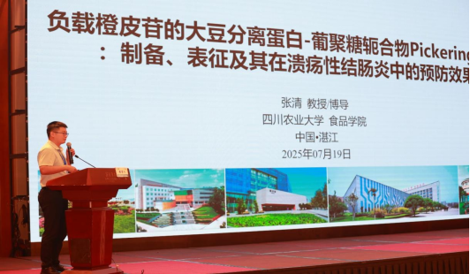 研讨会采用大会报告形式,一共安排26位40岁以下青年学者作报告。张清分享了题为《Hesperidin-loaded soybean protein isolate-dextran conjugates-stabilizedPickering emulsions: preparation, characterization, and anti-inflammatory activity in ulcerative colitis》的最新研究进展,介绍了基于大豆分离蛋白-葡聚糖轭合物稳定的Pickering乳液负载橙皮苷并用于溃疡性结肠炎的预防效果。近年来,团队在以植物蛋白改性与功能食品配料创制方面取得了系列研究成果,并在以豆制品、大米制品为代表的蛋白基或淀粉基食品等粮油食品开发与社会服务方面开展了大量工作。