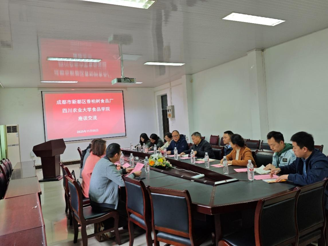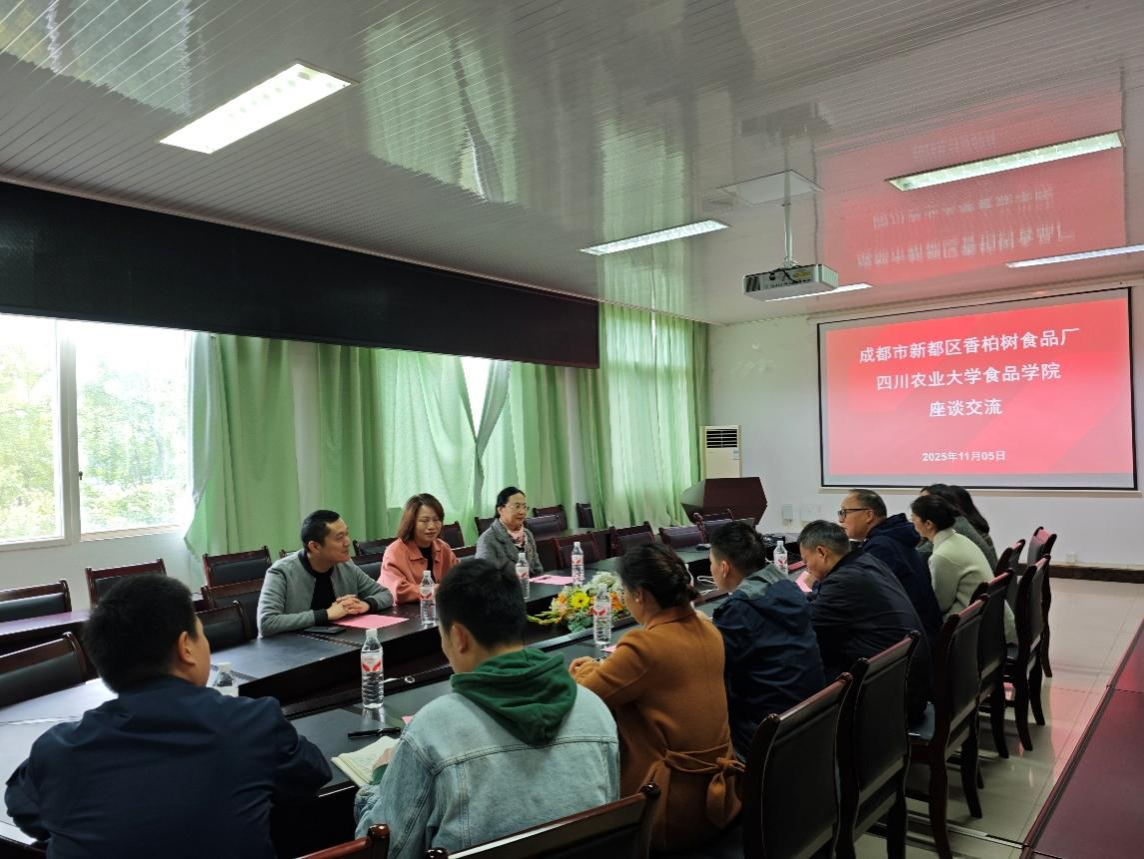 为推动食品科教与产业前沿深度融合,探索产教融合新路径,11月5日,四川省成都市新都区香柏树食品厂总经理陈美莺、营销总监童宇、品控总监付连波一行莅临四川农业大学食品学院开展座谈交流。食品学院畜产与发酵食品加工及安全团队刘书亮教授、杨勇教授、刘爱平教授等参与交流。