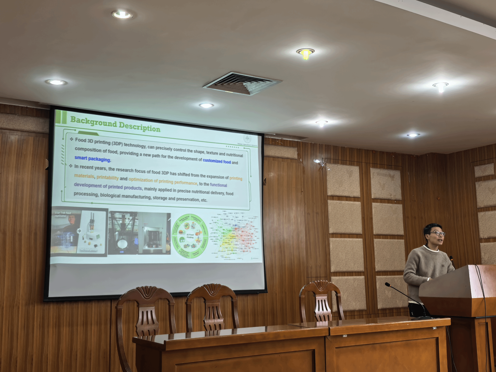 刘耀文则以《Food 3D Printing-Driven Customized Food and Smart Packaging Innovation》(食品3D打印驱动的定制食品与智能包装创新)为题,展示了近年来团队在3D打印食品和3D打印智能包装领域的理论研究、产品开发和设备创制等所做的工作,深入剖析了3D打印技术在营养定制化食品与食品保鲜智能包装领域的创新进展。报告详细阐述了该技术的具体实现路径、当前面临的关键挑战以及未来发展方向,为相关领域的科研与应用提供了重要思路。
