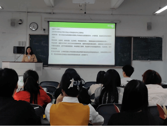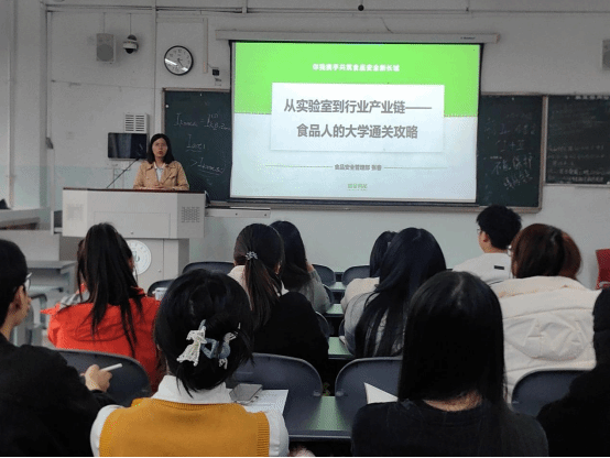 讲座伊始,张春结合自身从一线化验员成长为集团食品安全与质量板块负责人的职业经历,为学员们清晰呈现了食品专业人才的成长脉络与发展空间,她围绕行业发展核心展开讲解,打破学员对食品专业的传统认知。张春指出,除公务员、检测机构、企业研发等传统就业方向外,食品风味分析、食品安全大数据等新兴领域,以及食品+电商、食品+投资等跨界赛道正蓬勃发展,同时,她强调当下行业核心竞争已转向技术与商业思维兼备的复合型人才。