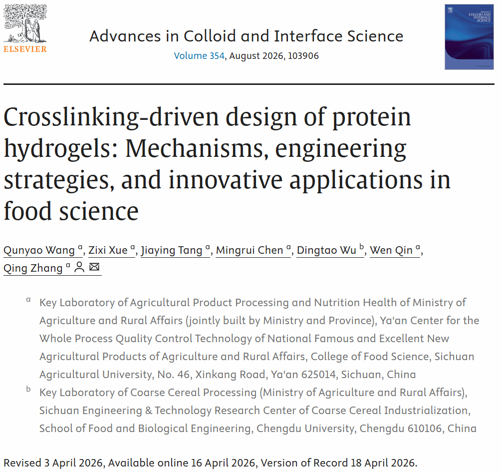 近日,国际顶级科学期刊《Advances in Colloid and Interface Science》(Q1,中科院1区Top,影响因子19.3)在线发表了食品学院院长张清教授题为“交联驱动蛋白质水凝胶的设计:机制、工程策略与应用(Crosslinking-driven design of protein hydrogels: Mechanisms, engineering strategies, and innovative applications in food science)”的综述性论文。该综述首次将分子相互作用、工程化策略与食品应用进行有机融合,为面向实际食品工业需求的蛋白质水凝胶定制化开发提供了科学、合理的系统性理论框架,对推动食品功能软材料从“经验试错”向“精准设计”的范式转变具有里程碑意义。