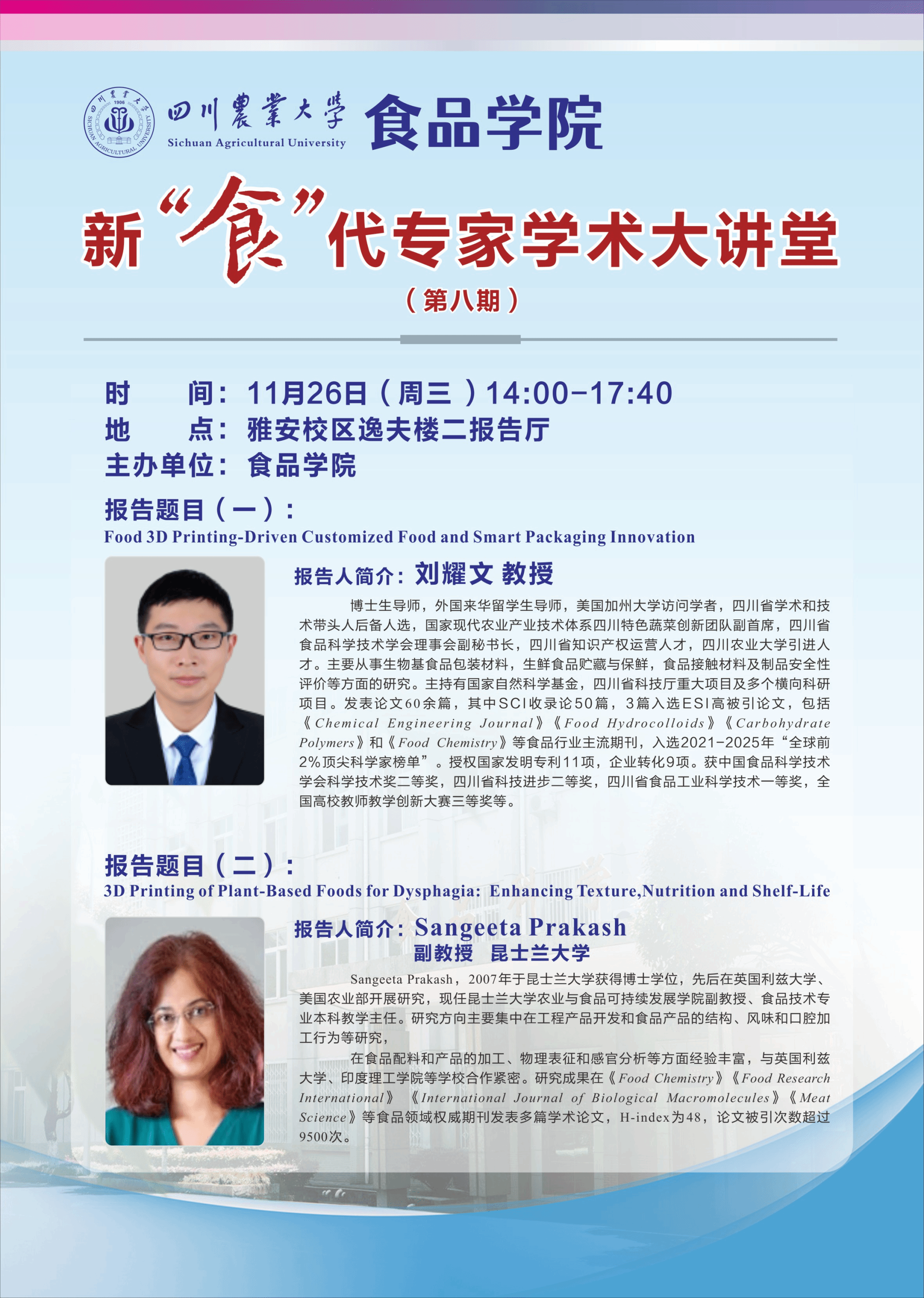 导航痕迹 四川农业大学 食品学院 首页 通知公告 正文 学院新闻 通知公告 新“食”代专家学术大讲堂—Food 3D Printing-Driven Customized Food and Smart Packaging Innovation 3D Printing of Plant-Based Foods for Dysphagia: Enhancing Texture,Nutrition and Shelf-Life 2025年11月25日 09:12 点击:[] 上一条:新“食”代专家学术大讲堂——国家自然科学基金申请的注意事项和经验分享 下一条:新“食”代专家学术大讲堂——四川省食品科技创新发展趋势与策略 【关闭】